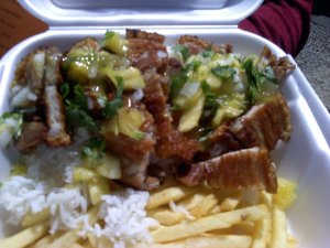 | The Garden Grove taco: BBQ Rib, korean style The taco was missing some… kick. Vietnamese Pork bellies over rice and fries. |
