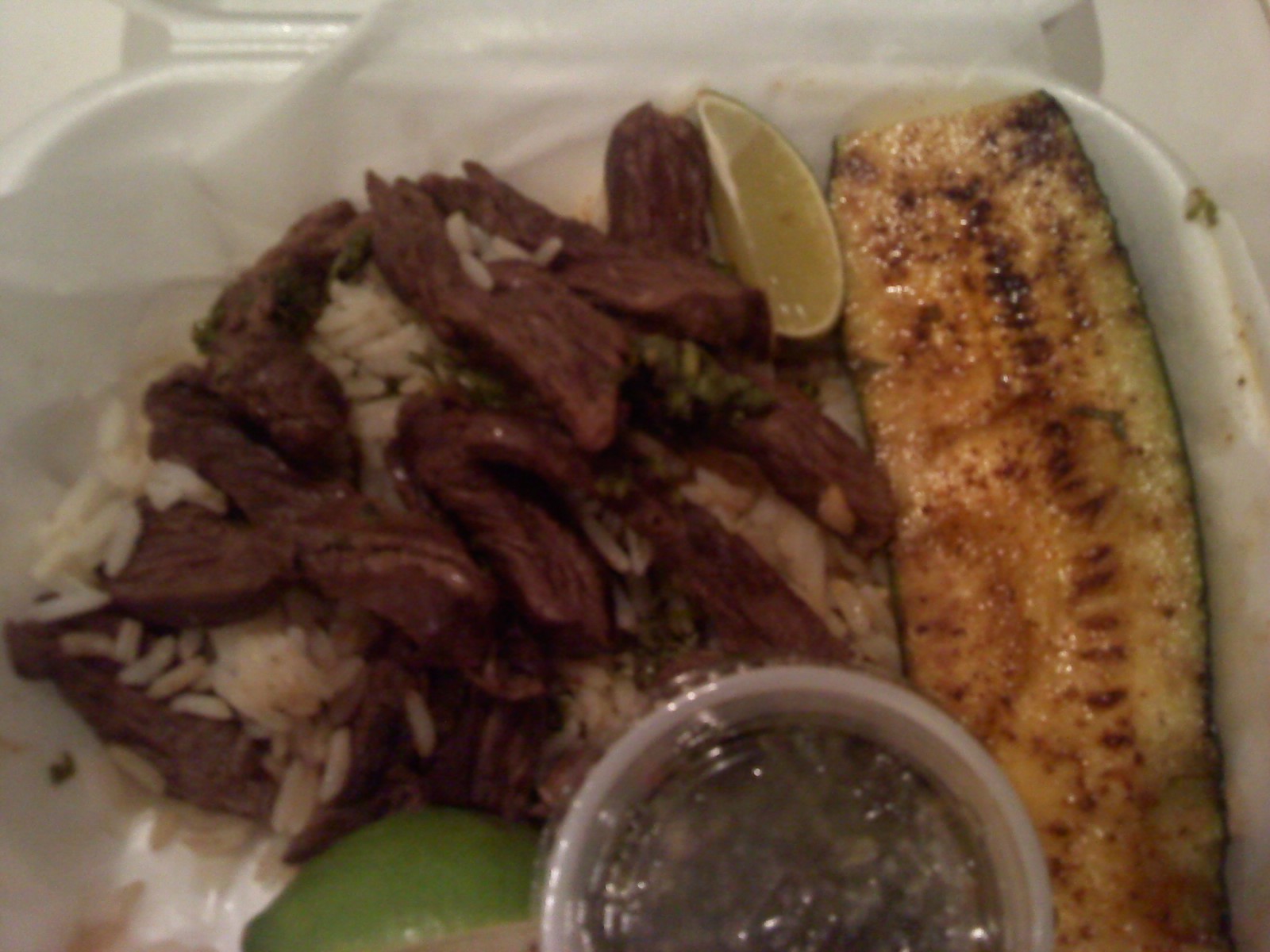 | Grilled skirt steak w/ zucchini over chimichurri rice |