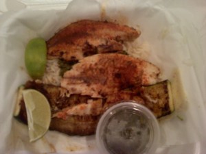 | Grilled tilapia and zuchinni over chimichurri rice |