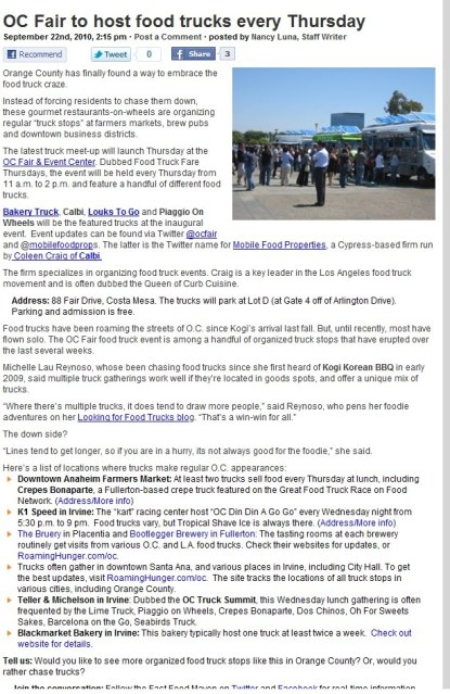I first met her in May 2010, when Oh For Sweets Sakes first launched at the REI in Santa Ana, and Brooklyn Boys decided to call it quits. She interviewed me while ordering food at Piaggio’s, and featured me (again) today! She had me give my two cents on food trucks in Orange County, and how I felt that trucks were learning to work as a team, not flying solo.