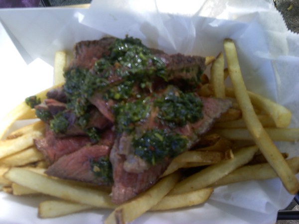 | Course 2: Steak (ordered rare) with chimichuri sauce over fries |