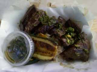 Skirt steak and zuchinni with chimichurri sauce over rice