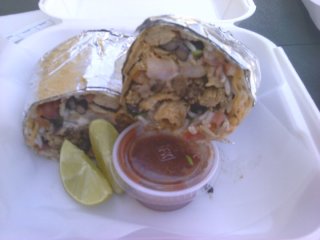 | The Tres Amigos burrito Shrimp, pulled pork and steak with rice, cheese, and other goodies. |