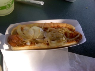 A chili w/ grilled onion hot dog from Greasy Wieners