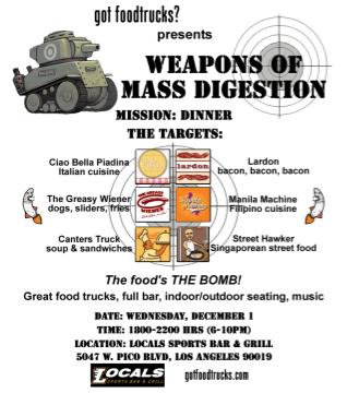 Dec 1: Weapons of Mass Digestion Food Event in LA November 30, 2010September 18, 2015Leave a comment Share this: Click to share on X (Opens in new window) X Click to share on Facebook (Opens in new window) Facebook Click to share on Tumblr (Opens in new window) Tumblr Click to share on Pinterest (Opens in new window) Pinterest More Click to share on LinkedIn (Opens in new window) LinkedIn Click to email a link to a friend (Opens in new window) Email Click to print (Opens in new window) Print Click to share on Reddit (Opens in new window) Reddit Click to share on Pocket (Opens in new window) Pocket Like Loading...