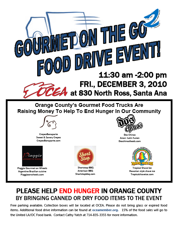 Dec 3: Gourmet on the Go2 – Food drive in Santa Ana! November 30, 2010September 18, 2015Leave a comment Attendees who bring canned food items to donate to the food bank will be entered into a raffle for multiple pairs of AMC movie tickets. Share this: Click to share on X (Opens in new window) X Click to share on Facebook (Opens in new window) Facebook Click to share on Tumblr (Opens in new window) Tumblr Click to share on Pinterest (Opens in new window) Pinterest More Click to share on LinkedIn (Opens in new window) LinkedIn Click to email a link to a friend (Opens in new window) Email Click to print (Opens in new window) Print Click to share on Reddit (Opens in new window) Reddit Click to share on Pocket (Opens in new window) Pocket Like Loading...