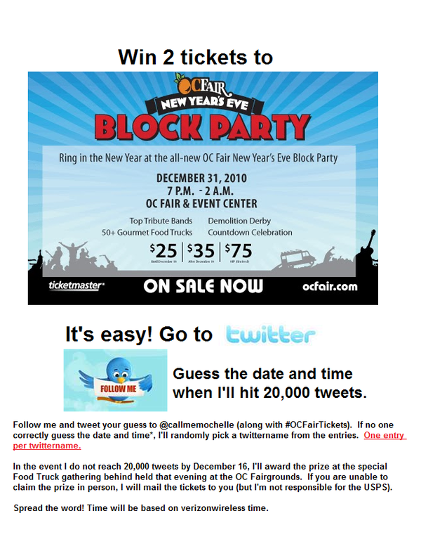 Win 2 FREE tickets to the OC New Year’s Eve event December 1, 2010September 18, 2015 Guess when I’ll hit 20,000 tweets and win these tickets! Share this: Click to share on X (Opens in new window) X Click to share on Facebook (Opens in new window) Facebook Click to share on Tumblr (Opens in new window) Tumblr Click to share on Pinterest (Opens in new window) Pinterest More Click to share on LinkedIn (Opens in new window) LinkedIn Click to email a link to a friend (Opens in new window) Email Click to print (Opens in new window) Print Click to share on Reddit (Opens in new window) Reddit Click to share on Pocket (Opens in new window) Pocket Like Loading...