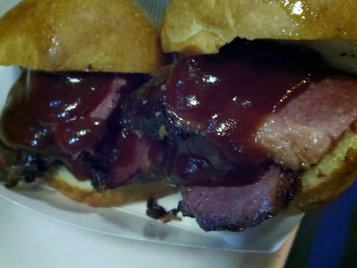 I started off with the Moink, which is the bbq bacon wrapped meatball, then proceeded with the pork slaw sliders, and the beef brisket slider.Martin ordered the Bacon slaw dog and the Pastrami sliders.