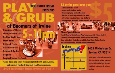 Jan 21: This Friday, Play & Grub at Boomers of Irvine January 20, 2011September 18, 2015 Share this: Click to share on X (Opens in new window) X Click to share on Facebook (Opens in new window) Facebook Click to share on Tumblr (Opens in new window) Tumblr Click to share on Pinterest (Opens in new window) Pinterest More Click to share on LinkedIn (Opens in new window) LinkedIn Click to email a link to a friend (Opens in new window) Email Click to print (Opens in new window) Print Click to share on Reddit (Opens in new window) Reddit Click to share on Pocket (Opens in new window) Pocket Like Loading...
