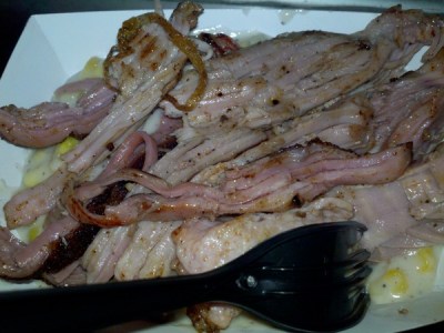 At Baconmania, I tried the Cheese and Bacon chips, and Karen ordered the “Mom’s meatloaf” topped with mashed potatoes and an order of fries. I also ordered my favorite comfort food, the Smoked turkey over creamed corn from the Shortstopbbq truck. Yah, the picture comes out bland, but it’s still one of my favorite dish.