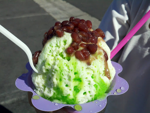 Karen got her usual shave ice flavors (Banana & Strawberry) and I tried the Horchata, Lychee, & Melona with Azuki beans. Both shave ices were snow capped.