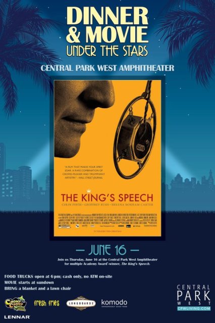 | OSCAR winning King’s Speech showing on Thursday, June 16th at Central Park West with Gourmet Food Trucks (Chomp Chomp Nation, Komodo, SpudRunners, Longboards Ice Cream) 6PM start. |