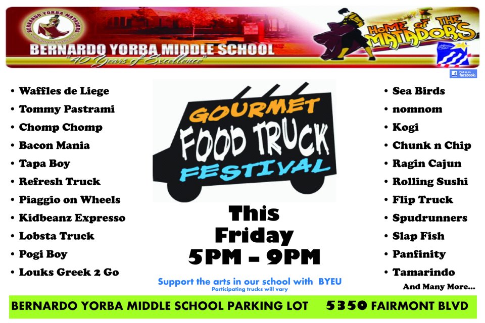 The Matador Gourmet Food Truck Round-Up will host 15+ gourmet food trucks. These award winning trucks will offer a wide variety of fare to tempt any and every appetite. Waffles, ceviche, panini, shave ice, sliders, BBQ, pastrami, chili, crepes, empinada, baklavah and SO much more. Many have been featured on TV’s Food Network, and all will not disappoint. Come visit our event on your way to the Octoberfest at the St Martin de Porres fair. 10% from every purchase will support the arts in our school. Show your support of Matador music, drama, color guard and chorus by dining with us. Look for flyers and banners all over Yorba Linda. This will be a recurring event.