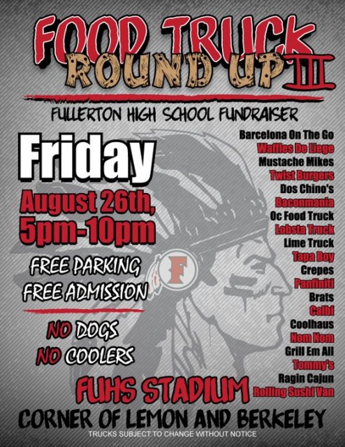 OCT 15: Fullerton HS Food Truck Round Up September 26, 2011September 18, 2015Leave a comment Next event is October 15th! Be sure to save the date. We will have more info shortly!! Share this: Click to share on X (Opens in new window) X Click to share on Facebook (Opens in new window) Facebook Click to share on Tumblr (Opens in new window) Tumblr Click to share on Pinterest (Opens in new window) Pinterest More Click to share on LinkedIn (Opens in new window) LinkedIn Click to email a link to a friend (Opens in new window) Email Click to print (Opens in new window) Print Click to share on Reddit (Opens in new window) Reddit Click to share on Pocket (Opens in new window) Pocket Like Loading...