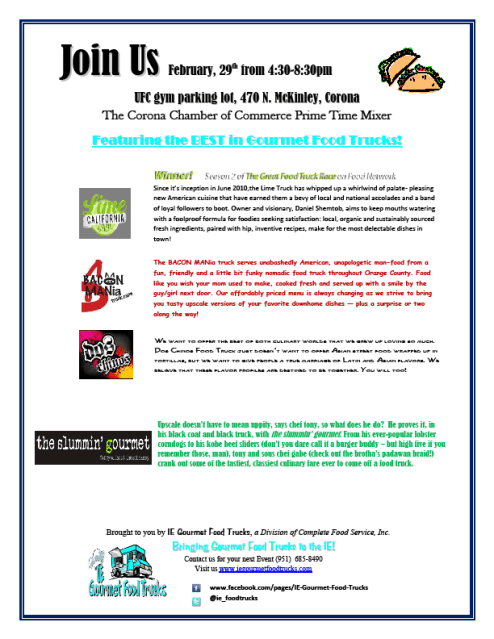ChompChomp, Tornado Potato, Rajun Cajun, Baconmania, Lobstatruck, and Panfinity tweeted they will be at the Tustin Auto Center at 1 Auto Center Drive from 5:00-9:00 pm tonight (Thursday, 1/26)