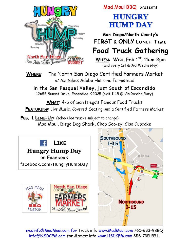 The North San Diego Farmers Market is proud to offer the Hungry Hump Day Lunchtime Food Truck Gathering as our EXCLUSIVE hot food/served meals offerings for lunch at the Farmers Market on these Wednesdays!