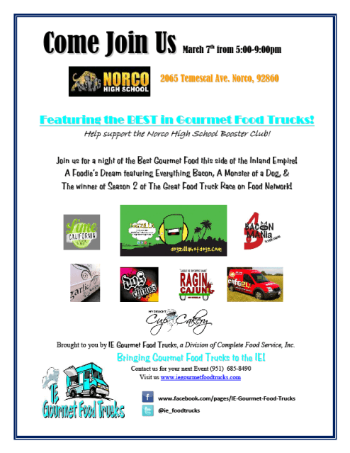 March 7: Norco HS with Gourmet Food Trucks February 16, 2012September 18, 2015 Share this: Click to share on X (Opens in new window) X Click to share on Facebook (Opens in new window) Facebook Click to share on Tumblr (Opens in new window) Tumblr Click to share on Pinterest (Opens in new window) Pinterest More Click to share on LinkedIn (Opens in new window) LinkedIn Click to email a link to a friend (Opens in new window) Email Click to print (Opens in new window) Print Click to share on Reddit (Opens in new window) Reddit Click to share on Pocket (Opens in new window) Pocket Like Loading...