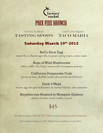 Taco María and Chef Joe Youkhan’s Tasting Spoon present a special four-course brunch at SoCo Farmer’s Market, March 10, 2012. Beginning at 11:30am during the regular Saturday market, the meal will feature courses from each chef as inspired by SoCo, the market vendors, and shops inside the OC Mart Mix.
