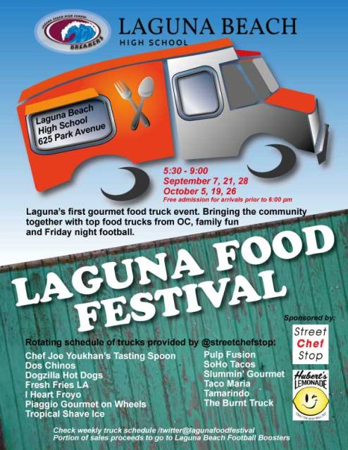 The “Laguna Food Festival” event will take place at Laguna Beach High School on Fridays in September and October.  It will run from 5:30-9pm during the football games, with a portion of proceeds going to the Laguna Beach Football Boosters