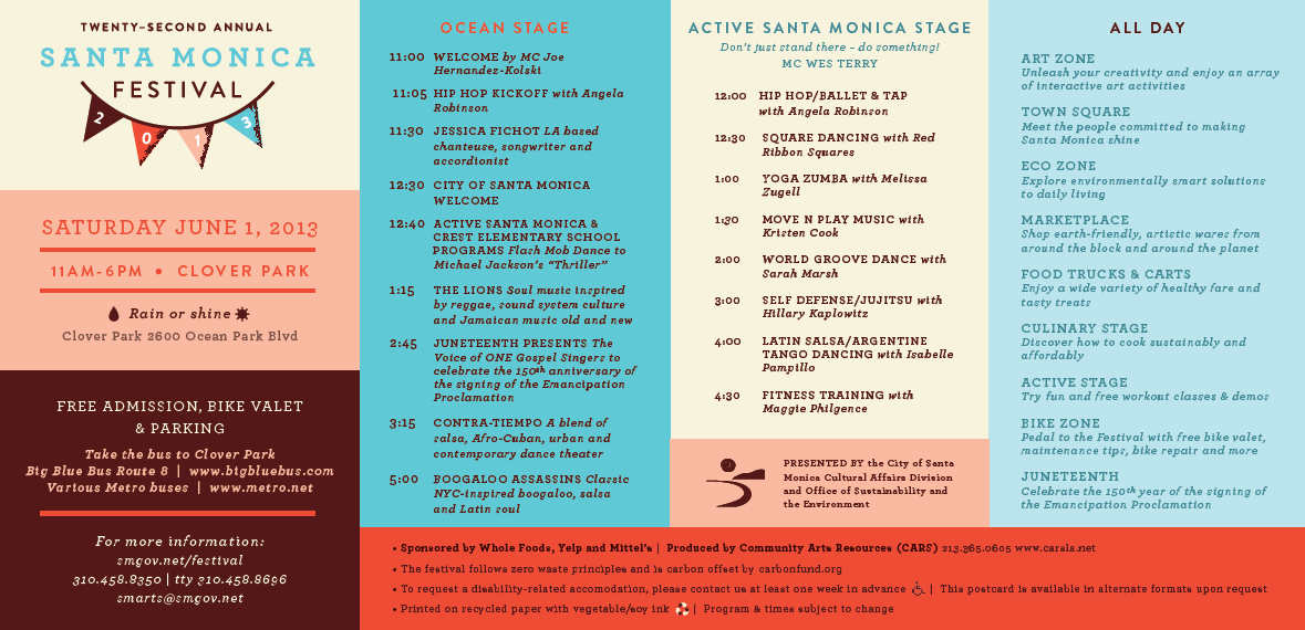 Mark your calendars, the 2013 Santa Monica Festival Date is set for Saturday, June 1st! Santa Monica’s beloved event is back with more music, dance, art, workout classes, food, workshops, unique vendors, local services offered by City, community and environmental organizations and MORE! Check back in here or on the festival website for more updates: www.smgov.net/festival