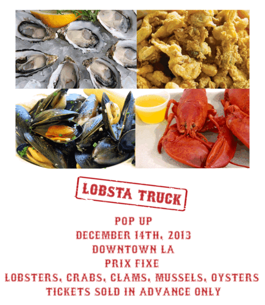 The first ever Lobsta Truck Pop Up will be taking place in Downtown LA on December 14th, 2013.We will be offering a prix fixe menu comprised of the following, a number of samplers between courses:First Course – Half Dozen Oysters on the Half Shell (2-3 varieties from New England & Canada)Second Course – Lobster BisqueThird Course – Steamed PEI MusselsFourth Course – 1.5 lbs Steamed Lobster with Roasted CornFifth Course – Blueberry Cobbler with Vanilla Ice CreamAdd-OnsOptional Course – Whole Belly Fried Ipswich Clams (add $14)Extra 1.5 lbs Steamed Lobster (Add $18)$67 includes tax and gratuity