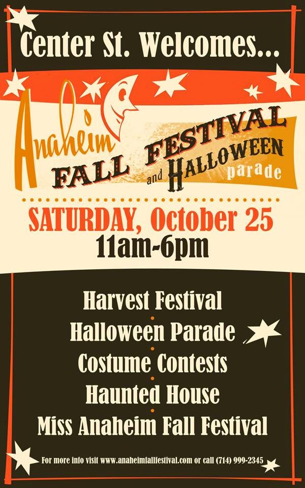 Join Center Street for the Anaheim Fall Festival on Saturday, October 25th from 11am-6pm with the Anaheim Halloween Parade starting at 6pm on Broadway! Center Street shops will be distributing treats, giveaways & specials for children, young and old! Look for this poster in participating shop windows and we look forward to seeing you on Saturday!