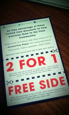 | Hey Titans! Keep an eye out for these flyers on campus with some coupons for some FREE grub Barcelona OntheGo & SpudRunners here at Humanities Plaza! Two more great reasons why you should come get your gourmet on with us Monday – Thursday 11-7 |