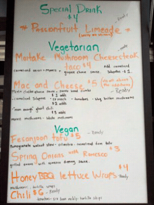 The Lime Truck was at the Petsmart Super Pet Adoption and had a fantastic VEGAN & VEGETARIAN menu (yes, as in no meat!). When we got to the truck, Jason first laughed at seeing us, and they laughed at his meatless menu. He said they only had $100 to work with on this challenge.
