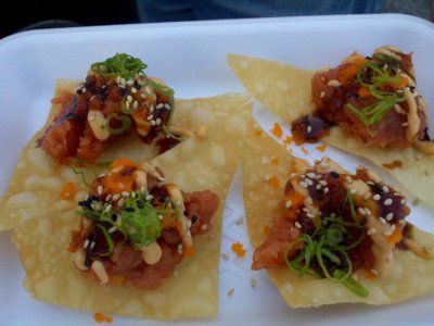 At Rolling Sushi, we picked up the Sashimi Salad, the Spicy Tuna Chips, and the Lobster Taco.